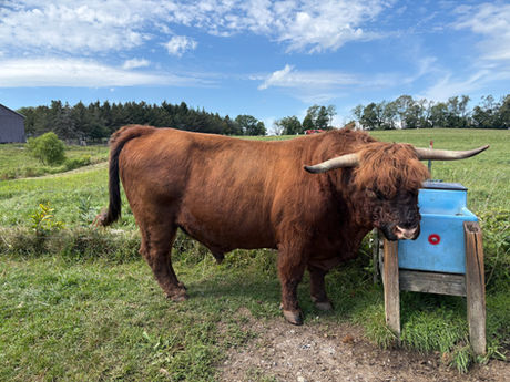 Registered Highland Bull - Molaug of Locustbrae (Mo) was calved February 2017, making him eight years old and in his prime. He is an excellent breed example with an awesome disposition. Give Mo a range cube or a handful of grass and he'll be your friend forever. No, we don't make our cattle into pets, so he's not going to cuddle with you. My wife tells me it's time to retire from the cattle, so Mo and a few others are for sale. He will do a fine job improving your breeding program and his pedigree is pretty awesome. We're not looking to get rich, so he's offered for a reasonable price to a proven good home.